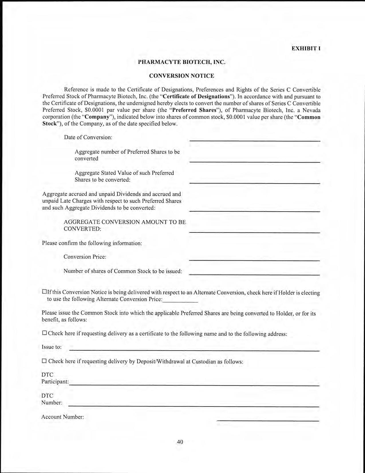 EXHIBIT I 40 PHARMACYTE BIOTECH, INC. CONVERSION NOTICE Reference is made to tbe Certificate of D esignations, Preferences and Rights of the Series C Convertible Prcfc 1 Ted Stock of Pharmacyle Biotech, Inc . (the " Ce rtific ate of D es ignations ") . ln accordance with and pursuant to the Ce rti ficate of Designations, the undersigned her eby elects to convert the number of shares of Series C Convertible Preferred Stock, $ 0 . 0001 par value per share (the " Preferred Shares'"), of Ph armacyte Biotcch, Inc . a Nevada corporation (the "C ompany' '), indicated below into shares of common stock, $ 0 . 0001 va lu e per share (the '' Co mmon Stock "), of the Company, as of the date specified below . Date of Conversion: Aggregate number of Preferred Shares to be converted Aggregate Stated Value of such Preferred Shares to be converted: Aggregate accrued and unpaid Dividends and accrued and unpaid Late Charges with respect to such Preferred Shares - and such Aggrega t e Dividends to be converted: AGGREGATE CONVERSION AMOUNT TO BE CONVERTE D: Please confinn th e following infonnation: Conversion Price: Number of shares of Common Stock to be issued: Ƒ If this Conversion Notice is being delivered with respect to an Alternate Conversion, check here if Holder is electing to use the following Alternate Conversion Price: _ Please issue the Common Stock into which the applicable Preferred Shares are being converted to Holder, or fo r its benefit, as follows: D Check here if requesting delivery as a certilicatc to the following name and to the following address: lssue to: 0 Check here if requesting delivery by Deposit/Withdrawal at Custodian as follows: OTC Participant: OTC Number: Account Number: