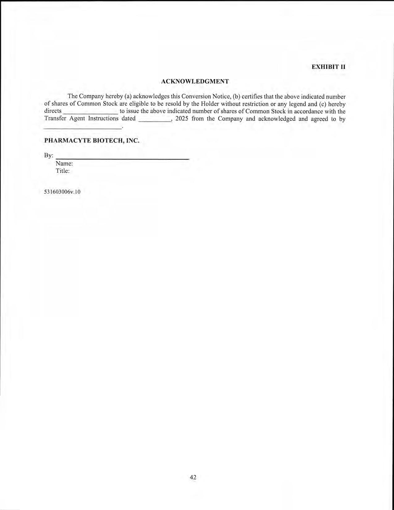 EXHIBIT II 42 ACKNOWLEDGMENT The Company hereby (a) acknowledges this Convers i on Notice, (b) certifies that th e above indicated number of shares of Common Stock are eligible to be resold by the Holder without restriction or any legend and (c) hereby directs toissue the above indicated number of shares of Common Stock in accordance with the Transfer Agent lnstructions dated , 2025 from the Company and acknowledged and agreed to by PRARMACYTE BroTECH, INC. By: Name: Tit le: 531603006v . I0