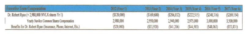 1) Compensation: Temporary Salary Equivalent, President and CEO. In lieu of a standard salary, as agreed to by the Chairman of Nuvilex and in recognition of the quantity and extent of work performed and as a result of insufficient operating capital in the Company and until there is sufficient operating capital, the Company shall issue to Dr. Ryan Four Hundred Fifteen Thousand (415,000) shares in Nuvilex Common Stock each month starting January 31, 2012 through the end of the Compensation Term defined herein and except as changed as indicated herein. Such shares are deemed to have been earned on the last day of each respective month and are based on the market closing share price on the last day of such month accordingly.