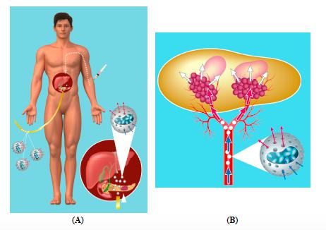 Chart B shows the human pancreas and generalized depictions of two pancreatic cancer tumors (shown in pink) as examples. In this chart, ifosfamide is converted to its cancer-killing form by the encapsulated live cells implanted near the tumors (shown in maroon).