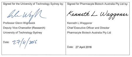 We refer to recent discussions regarding the need to clarify several terms and correct the named Licensee in the License Agreement between University of Technology, Sydney and Pharmacyte Biotech Australia Pyt Ltd, formerly Nuvilex Australia Pty Ltd, made on 10 October 2014 ("License Agreement").