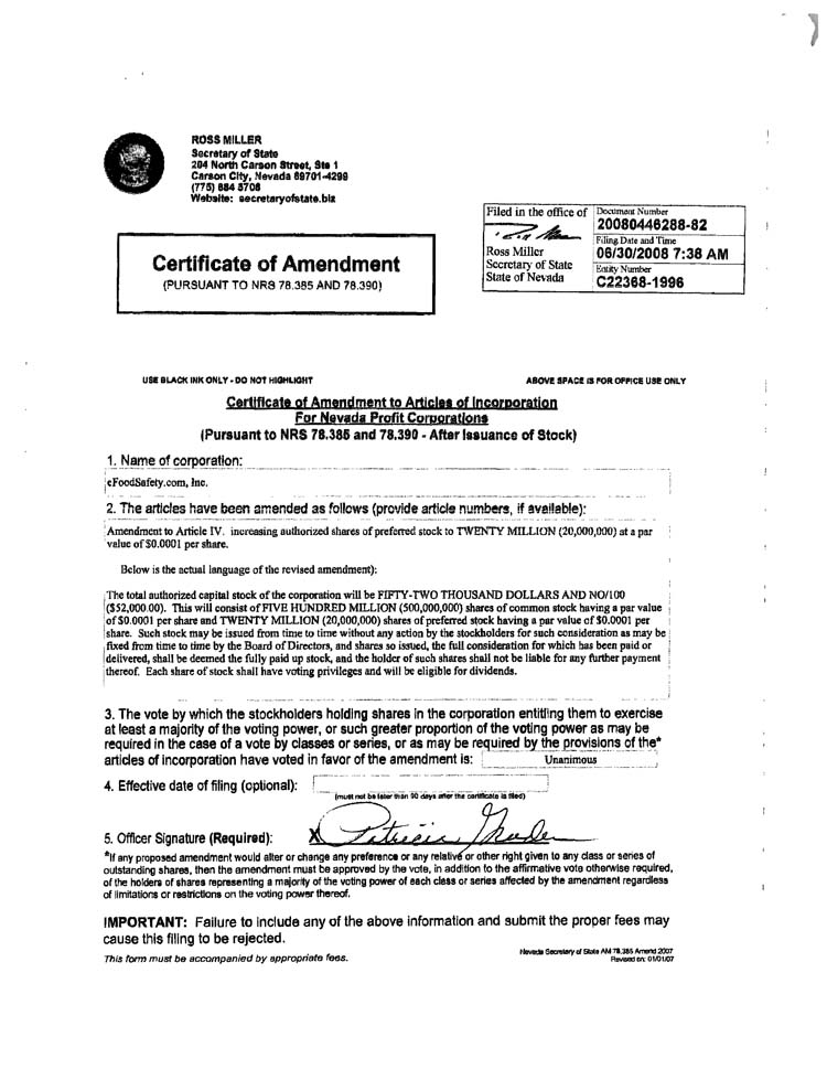 | 4. | This Certificate of Amendment shall be effective upon filing with the Secretary of State of the State of Nevada. |